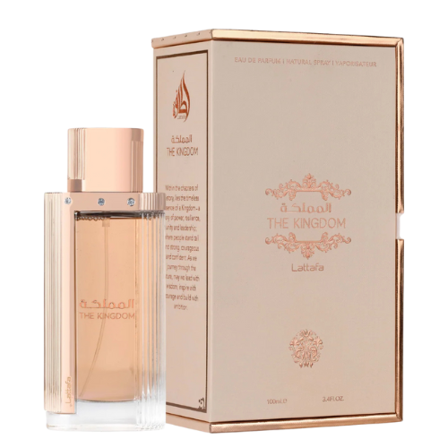 Lattafa The Kingdom is a luxurious floral fruity gourmand fragrance designed for women. Opening with crisp pear, delicate peony, and tart cassis, it transitions into a sweet heart of praline, tonka bean, and jasmine. The composition settles into a warm, sensual base of vanilla, musk, sandalwood, and amber that lingers beautifully throughout the day.